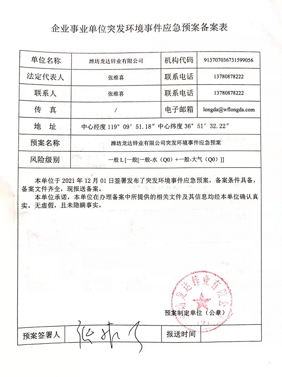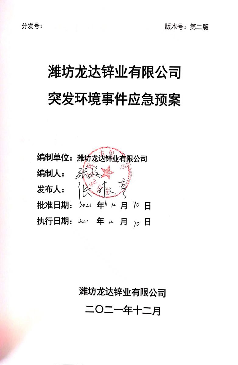 潍坊龙达锌业有限公司突发环境应急预案及演练记录