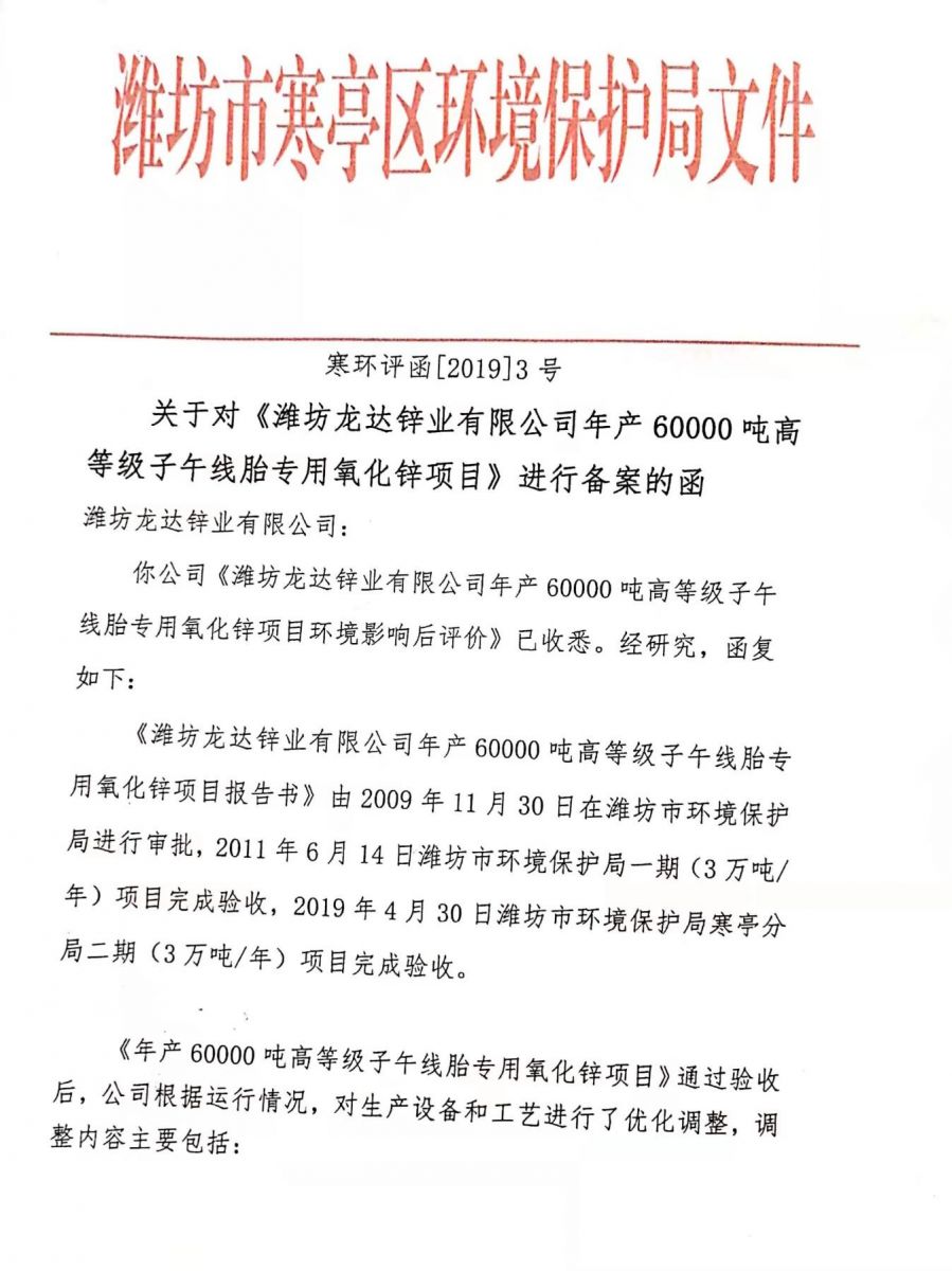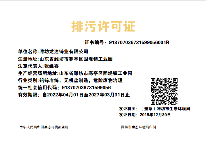 公司于2013年1月27日经山东环保厅验收核发临时《危险废物经营许可证》,经营类别:(HW23:336-1032-23)含锌废物,于2014年1月27日经山东环保厅换证验收合格后,核发正式的《危险废物经营许可证》。2017年申报换证,《危险废物经营许可证》(鲁危证83号)的有效期限为2018年3月5日至2022年6月16日。核准经营方式为收集、贮存、利用,经营规模为12500吨/年。2022年5月6日申报换证,现有《危险废物许可证》(潍坊危证27号)的有效期限为2022年7月5日至2027年7月4日。核准经营方式为收集、贮存、利用,经营规模为12500吨/年。